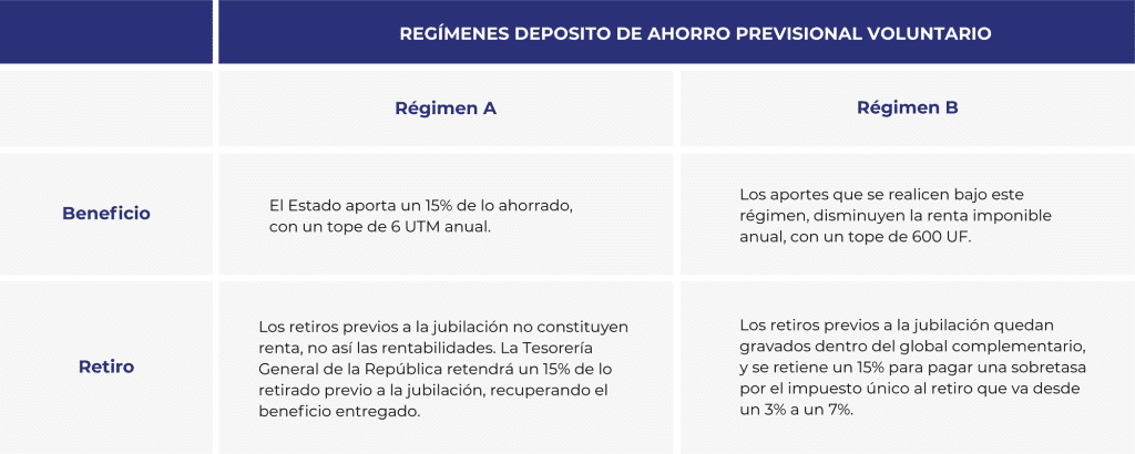 Ahorro Previsional Voluntario (APV): el APV se puede realizar a través de aportes directos por única vez, o bien ahorros mensuales con cargo a tu cuenta corriente o por descuento mensual vía tu empleador.